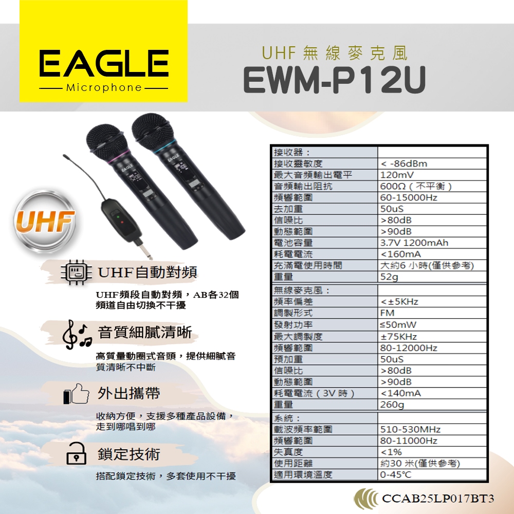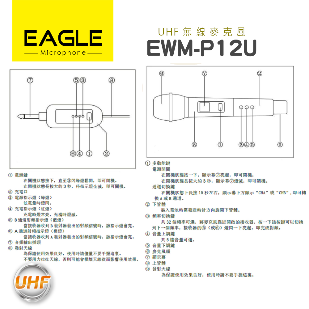 EAGLE EWM-P12U UHF無線麥克風,專為教學、演講等場合設計,操作簡易,讓您輕鬆上手。