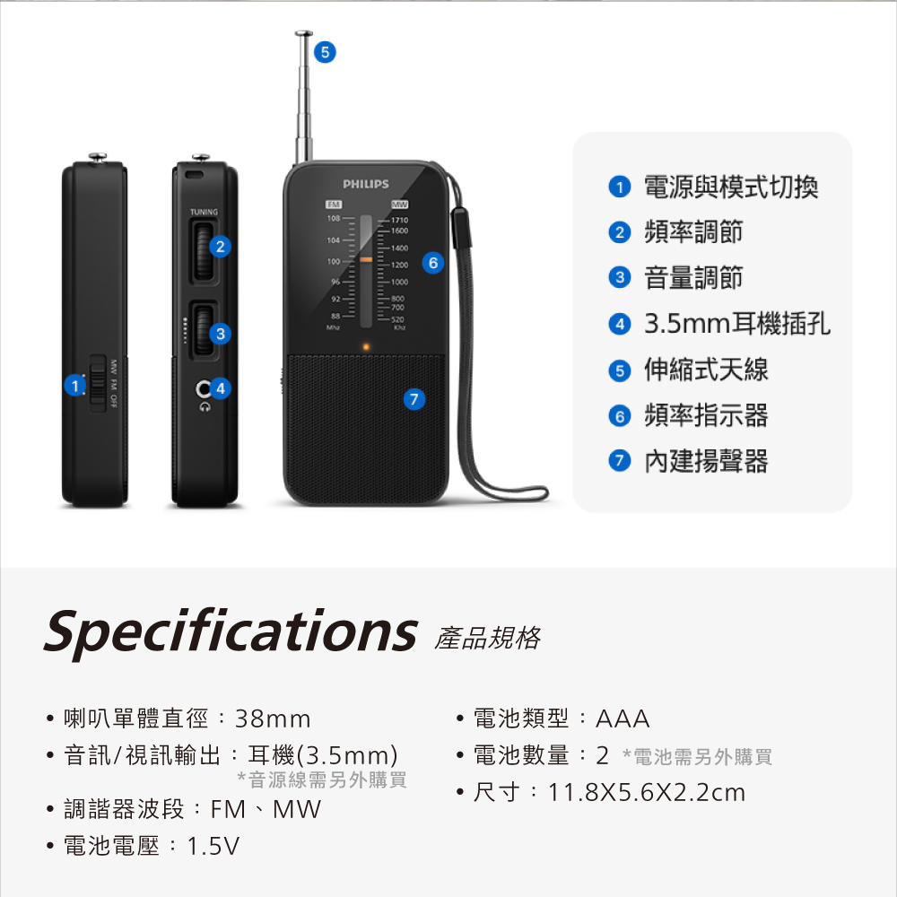 .類比 FM/AM 收音機,長型天線提供更好的收訊品質