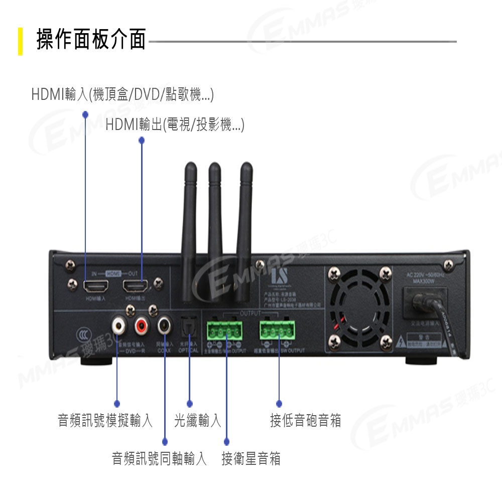 - 外部訊號輸入:藍芽、HDMI(機頂盒/DVD/點歌機...)、USB、A/V同軸、光纖