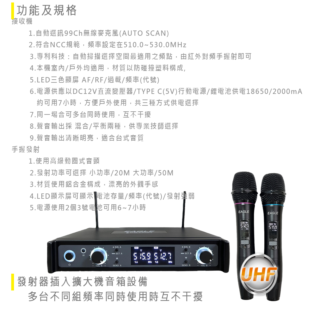 • 配件:接收機、手握式無線麥克風*2、說明書、保證書。
