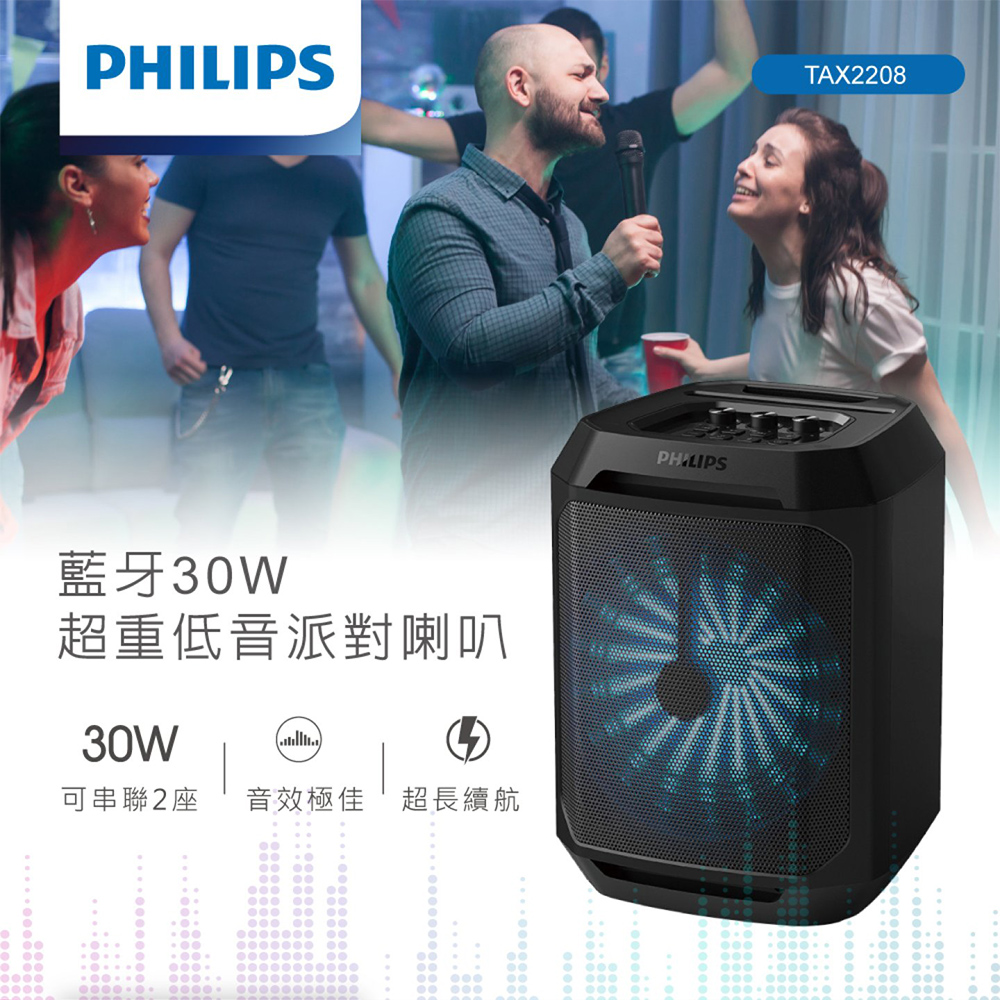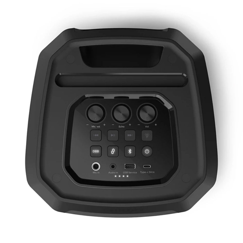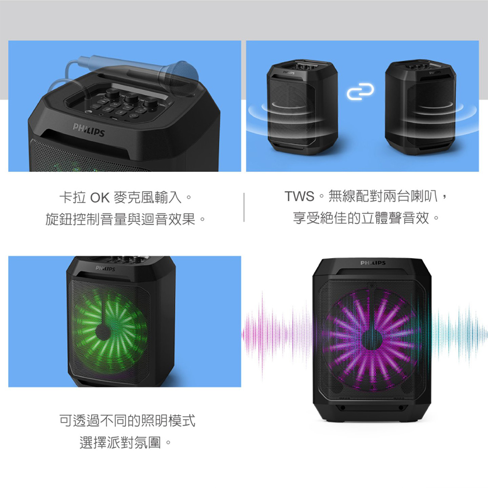 •藍牙喇叭搭配派對燈光和卡拉 OK 功能,能無線連接兩台喇叭,享受絕佳的立體聲音效。